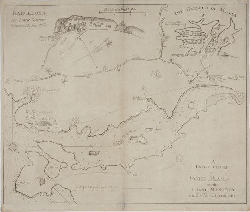 Rara carta marina que presenta en una sola hoja tres detalladas cartas portuarias: el gran plano del puerto de Mahón en la isla de Menorca (Baleares) como título principal, acompañado de Barcelona by John Gaudy y The Harbour of Malta. Cada una muestra con precisión los accesos marítimos, sondas, anclajes y defensas costeras de estos estratégicos puertos mediterráneos. Publicada en The English Pilot....