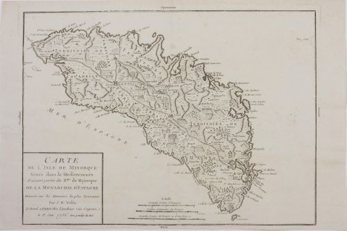 46 x 56 cm. Un gran mapa de la isla de Menorca dibujado por Lempriere, datado en 1779. Este mapa se compone de tres partes diferentes. En la parte inferior central se encuentra el propio mapa de Menorca, con subdivisiones territoriales resaltadas en rojo. A la izquierda, una cartela contiene el título del mapa y las escalas, mientras que a la derecha, otra cartela incluye la descripción de Menorca...
