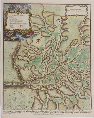 Este mapa militar fue realizado por James Basire, grabador británico, en 1745. Representa los campamentos enfrentados durante el asedio de Prats del Rey (actual Prats de Rei, Cataluña) en el contexto de la Guerra de Sucesión Española. Muestra la disposición de las tropas aliadas (bajo el mando del Conde de Staremberg) y las francesas (bajo el Duque de Vendôme), y la ubicación de cuarteles, caminos,...