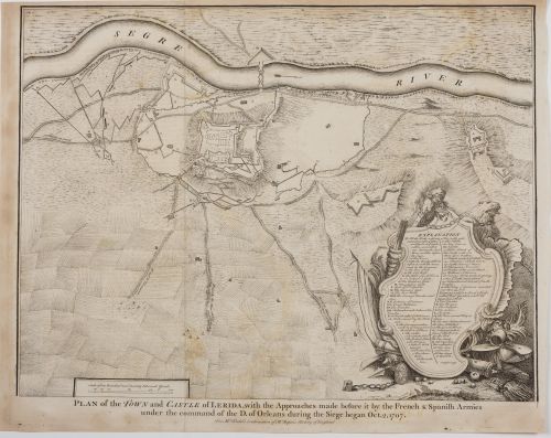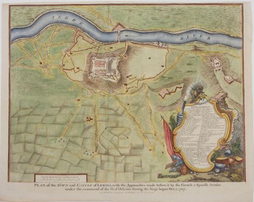 Este plano militar de la ciudad y el castillo de Lérida (Lleida, Cataluña) fue realizado por James Basire, importante grabador británico del siglo XVIII. Representa el asedio iniciado el 2 de octubre de 1707 por los ejércitos francés y español bajo el mando del Duque de Orleans durante la Guerra de Sucesión Española. El mapa muestra las líneas de aproximación, fortificaciones, posiciones militares...