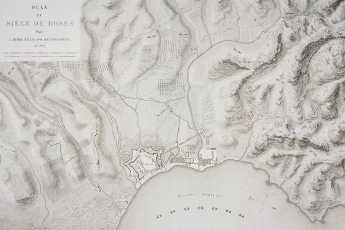 Importante plano del asedio de Rosas durante la Guerra de los Segadores, entre el 2 de abril y el 29 de mayo de 1645. En 1644, el ejército francés controla gran parte de Cataluña, pero el gobernador de Rosas, Diego Caballero, organiza una resistencia férrea. El 2 de abril de 1645, el mariscal conde du Plessis-Praslin establece un sitio de la ciudad, defendida por solo 1.300 hombres contra 8.000 franceses....