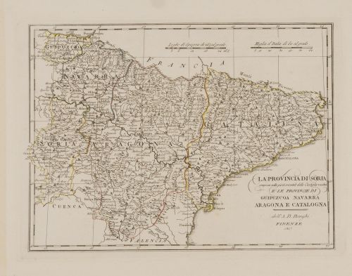Mapa histórico detallado que representa la provincia de Soria junto con las provincias de Guipúzcoa, Navarra, Aragón y Cataluña en el nordeste de la península ibérica. Elaborado por Bartolomeo Borghi, matemático y cartógrafo italiano, y publicado en Florencia, este mapa destaca la división territorial y la orografía de la región, incluyendo ciudades, ríos y montañas, con una precisión típica de principios...