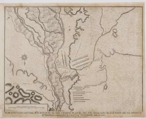 Grabado topográfico de los campos y campamentos de Almenar, mostrando el dispositivo del ejército de Carlos III por un lado y el del enemigo bajo el Duque de Anjou por el otro, realizado por James Basire en 1732. La batalla de Almenar se libró el 27 de julio de 1710 durante la Guerra de Sucesión española, en el marco de la última ofensiva de los partidarios del archiduque Carlos contra las tropas...