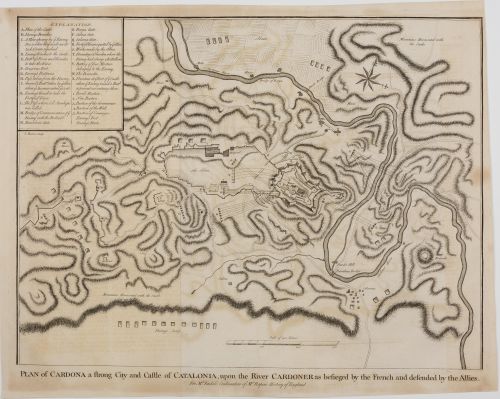 Grabado topográfico de la poderosa ciudad y castillo de Cardona en Cataluña, realizado por James Basire en 1732. La representación destaca las imponentes fortificaciones y el río Cardoner, subrayando su relevancia estratégica en el contexto bélico del período. Publicada para ilustrar las batallas de la Guerra de Sucesión Española (1701-1714) en las que intervinieron tropas británicas, esta vista captura...