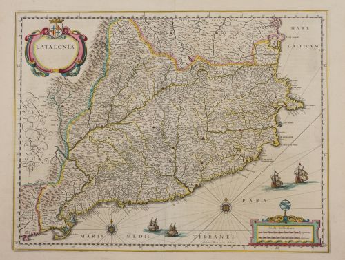58 x 67 cm. Gran mapa de Cataluña, muy ornamentado y coloreado a mano, de Nicolas Visscher, extraído de su Atlas Contractus Orbis Terrarum Praecipuas ac Novissimas Complectens Tabulas, fechado hacia 1677 or 1680. El mapa ofrece numerosos detalles toponímicos y topográficos, que se muestran pictóricamente. Una rosa de los vientos con una flor de lis apunta al norte, mientras que una estrella indica...