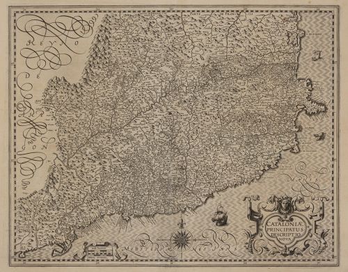 Importante mapa antiguo del Principado de Cataluña, procedente del célebre atlas de Mercator-Hondius, en una cuidada edición publicada en Ámsterdam en 1628. El grabado ofrece una representación muy detallada del territorio, con una densa toponimia que recoge numerosas villas, pueblos y ciudades catalanas, entre ellas Barcelona, Tarragona y Lleida. La cartografía abarca asimismo el Rosellón, representado...