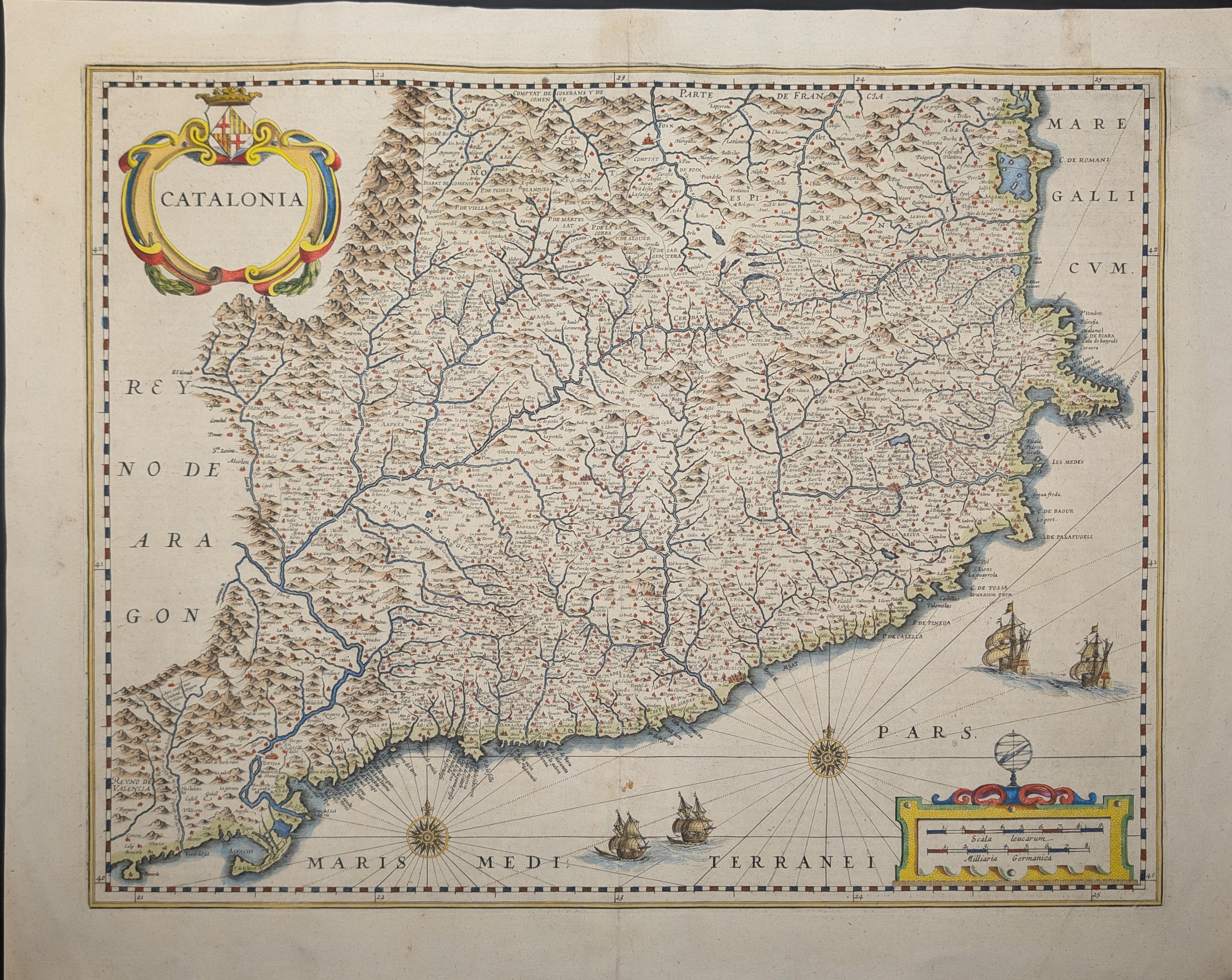 This original antique map is one of the most celebrated and aesthetic representations of Catalonia produced during the Golden Age of Dutch cartography. Published by the prestigious workshop of Willem Blaeu in Amsterdam, the engraving depicts the Catalan territory at its maximum historical extent, spanning from Peñíscola and the Ebro Delta in the southwest to the County of Roussillon in the northeast, prior to the territorial cessions of the 1659 Treaty of the Pyrenees.