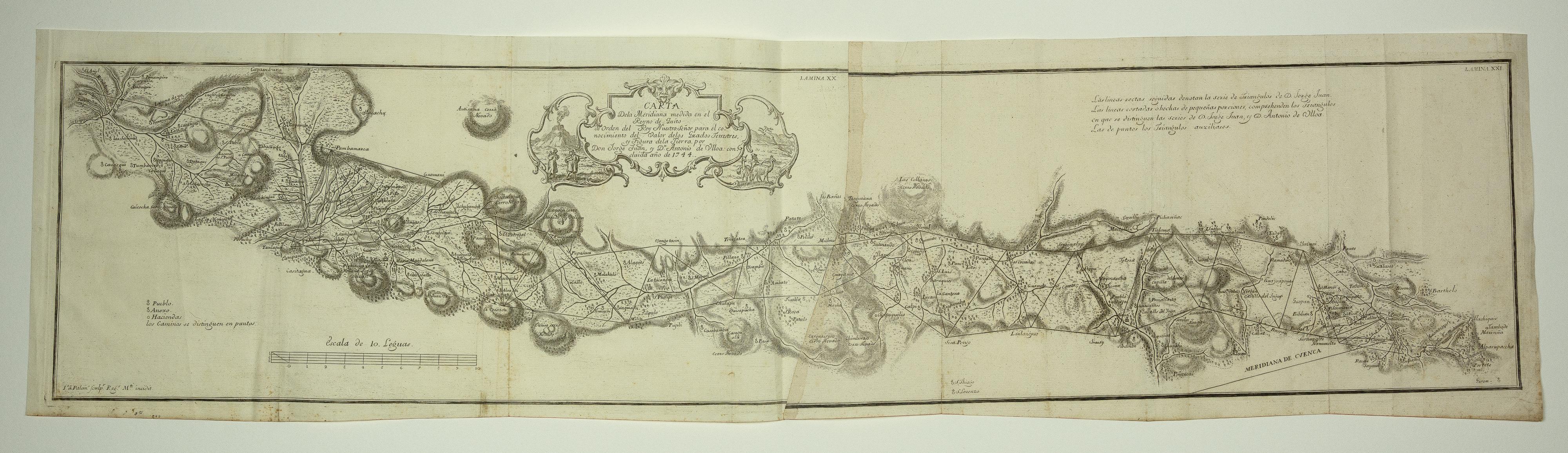 Largo mapa horizontal de las regiones Andinas del ecuador. El mapa se extiende desde la ciudad de Ambuquí en el norte hasta la ciudad de Cuenca al sur. El mapa se publicó en Madrid en 1748 por Jorge Juan y Antonio de Ulloa quienes participaron en la Misión Geodésica Francesa (1735-1744) en Sudamérica para medir el meridiano terrestre en la Real Audiencia de Quito. Durante esta expedición, recopilaron valiosa información sobre geografía, cartografía, astronomía y los recursos naturales de la región. Juntos, publicaron "Relación histórica del viaje a la América Meridional" (1748), un importante trabajo sobre la geografía y cultura sudamericana. También realizaron contribuciones a la navegación y la cartografía en la Armada Española. Este mapa forma parte de la colección que se realizó para poder medir algunos grados de meridiano terrestre y venir por ellos en conocimiento de la verdadera figura y magnitud de la tierra, con otras varias observaciones astronómicas y físicas. A lo largo del mapa encontramos ciudades tan importantes como Ambuquí, Cotacachi, Otavalo, Pambamarca, Quito, Machachi, Latacunga, Ambato, Calpí, Guamote, Alausí, Biblián, Azogues y Cuenca. Además, se muestra el relieve en un sombreado muy elegante y representativo del mismo. Condición Buena, con marcas de plegado.
