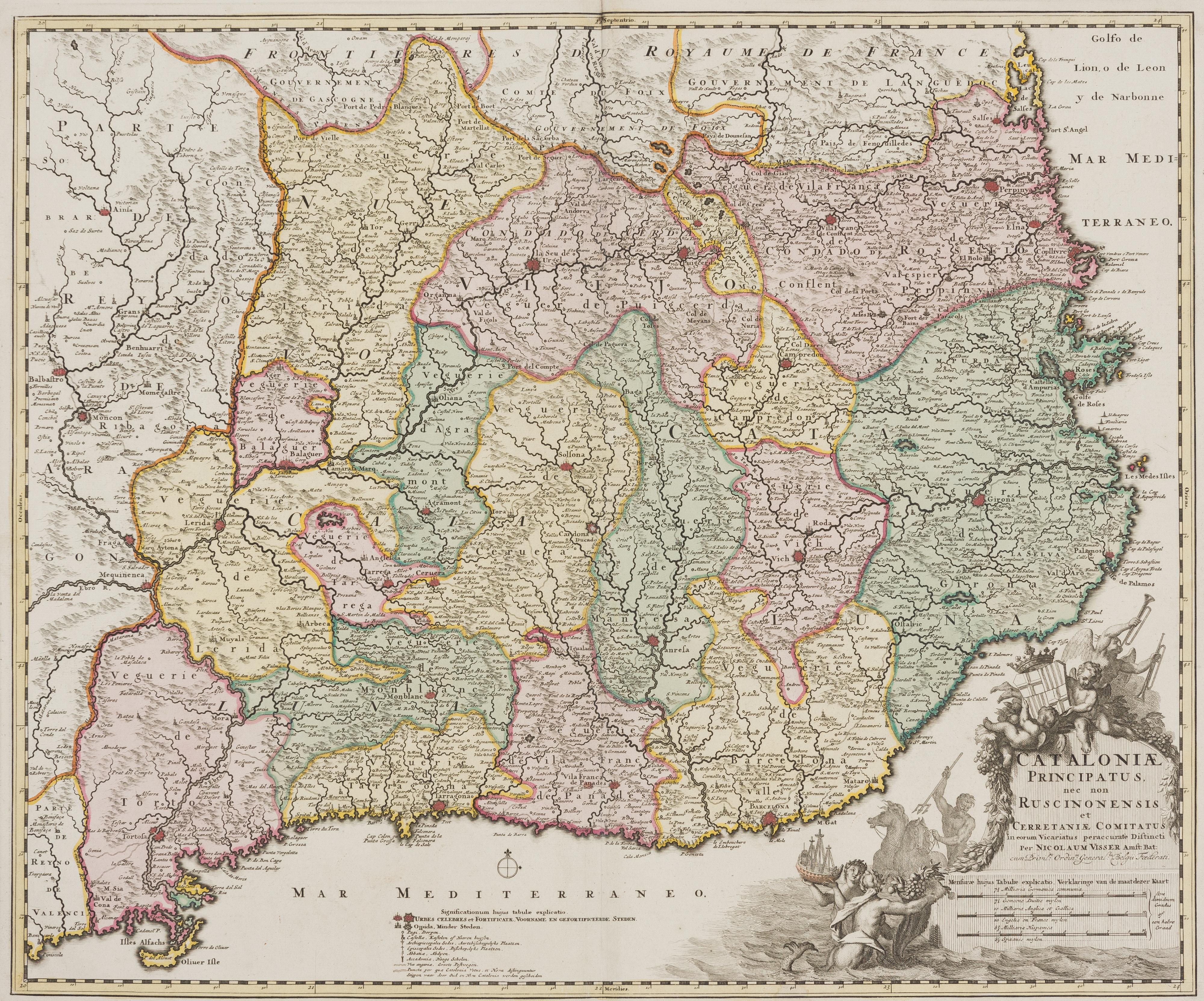 58 x 67 cm. Gran mapa de Cataluña, muy ornamentado y coloreado a mano, de Nicolas Visscher, extraído de su Atlas Contractus Orbis Terrarum Praecipuas ac Novissimas Complectens Tabulas, fechado hacia 1677 or 1680. El mapa ofrece numerosos detalles toponímicos y topográficos, que se muestran pictóricamente. Una rosa de los vientos con una flor de lis apunta al norte, mientras que una estrella indica el este. En el extremo derecho del mapa hay una cartela decorativa, que incluye figuras alegóricas, el díos Neptuno y Tritones, un escudo de armas de Barcelona y escalas. ------------------------------------------------------------------------ A large, highly ornemental, hand-coloured map of Catalonia by Nicolas Visscher from his Atlas Contractus Orbis Terrarum Praecipuas ac Novissimas Complectens Tabulas, dated circa 1677 or 1680. The map offers many toponymic and topographical details, which are shown pictorially. A compass rose featuring a fleur-de-lys points north, with a star indicating east. On the far right-hand side of the map lies a decorative cartouche, including allegoric figures, Neptune and Tritons, a coat of arms of Barcelona and scales. c. 1678