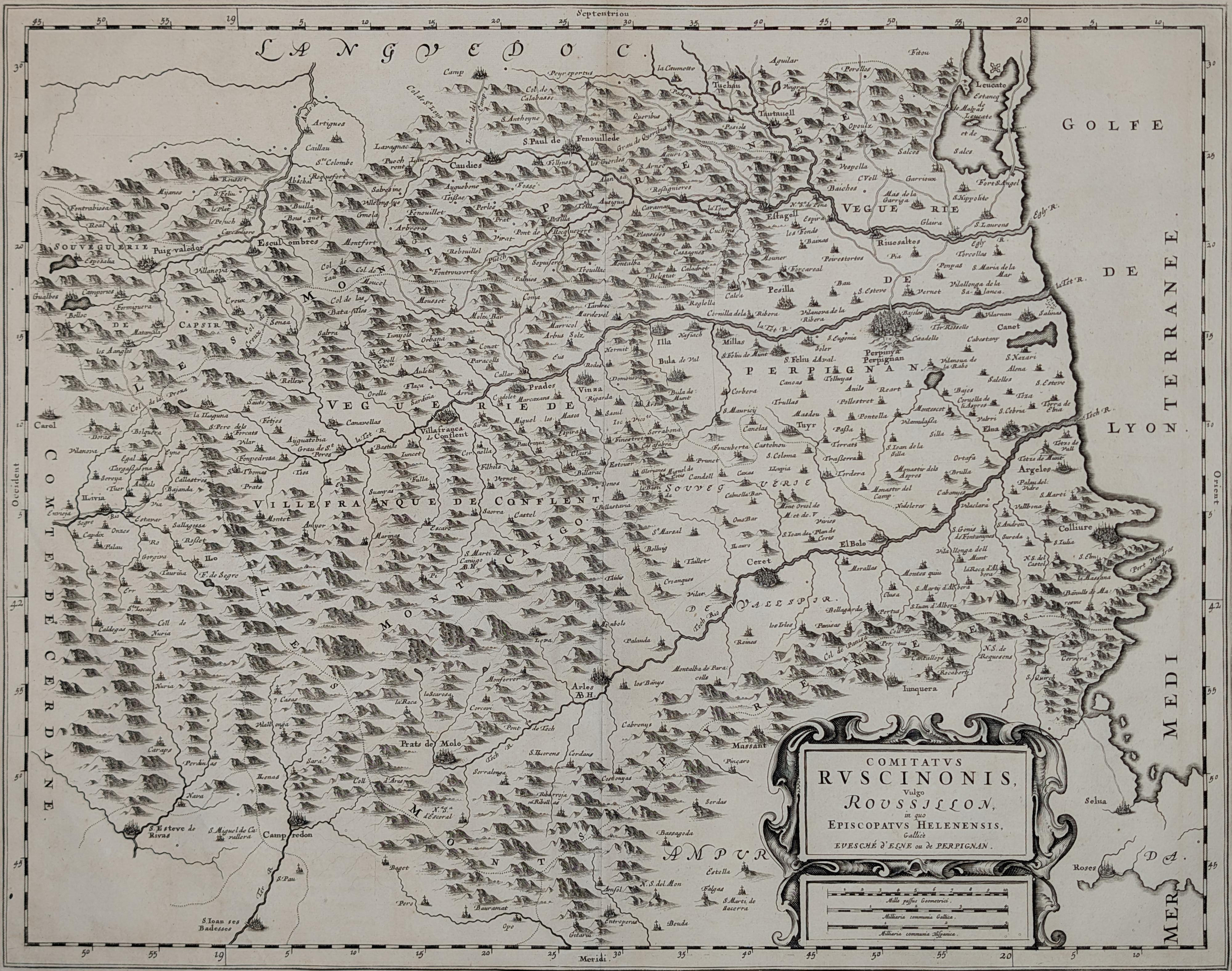 Cette carte ancienne originale est une élégante représentation du Comté de Roussillon, réalisée vers la fin de l'âge d'or de la cartographie aux Pays-Bas. Publiée par le prestigieux atelier de Blaeu, la gravure détaille le territoire à une étape historique clé, juste après sa cession définitive à la France. La cartographie est délimitée géographiquement par l'étang de Salses-Leucate et le château de Puilaurens (Puig Laurent) au nord ; la ville de Llivia à l'ouest ; et les localités de Prats de Mollo, Camprodon et Roses marquant la limite sud.