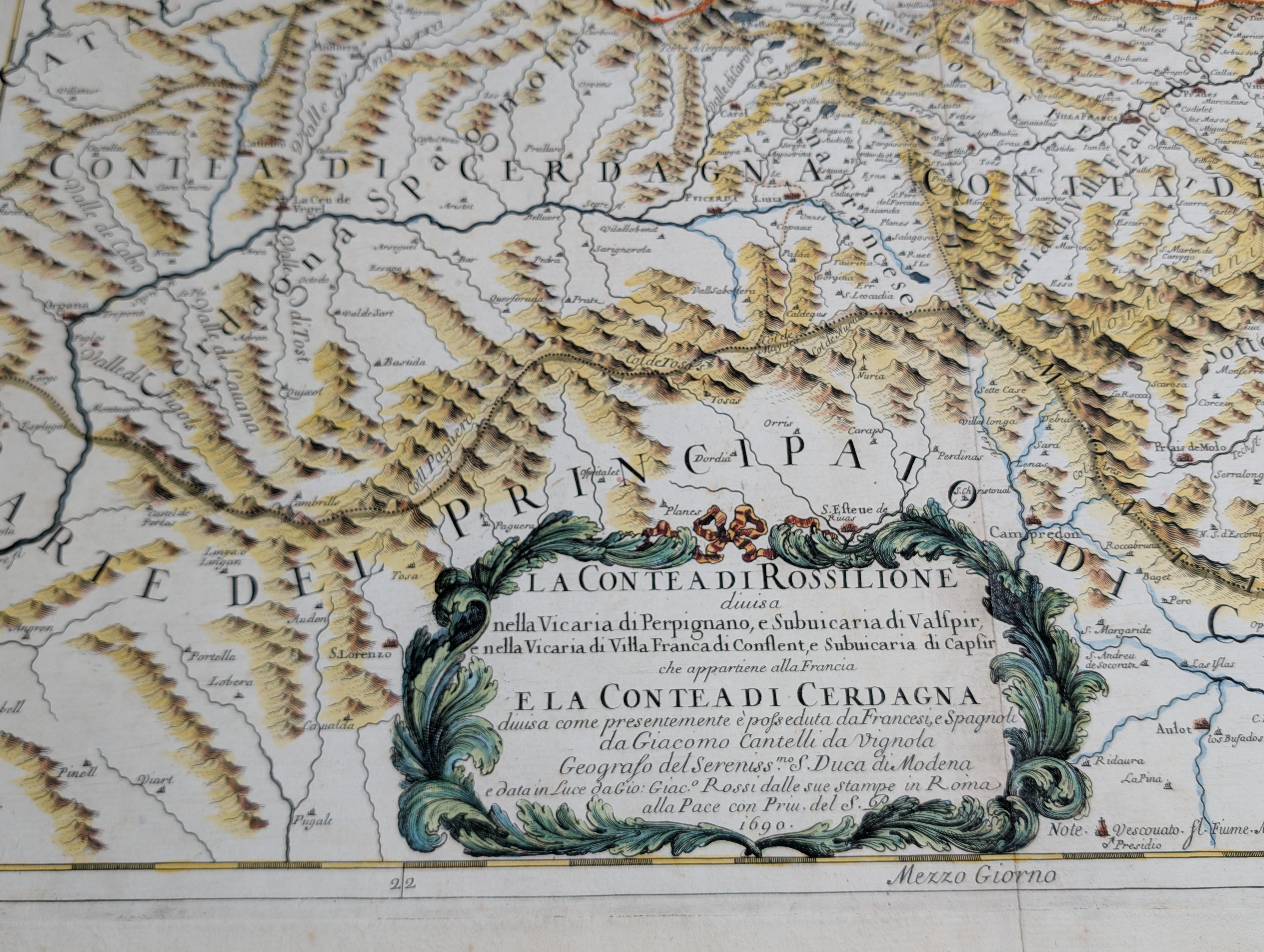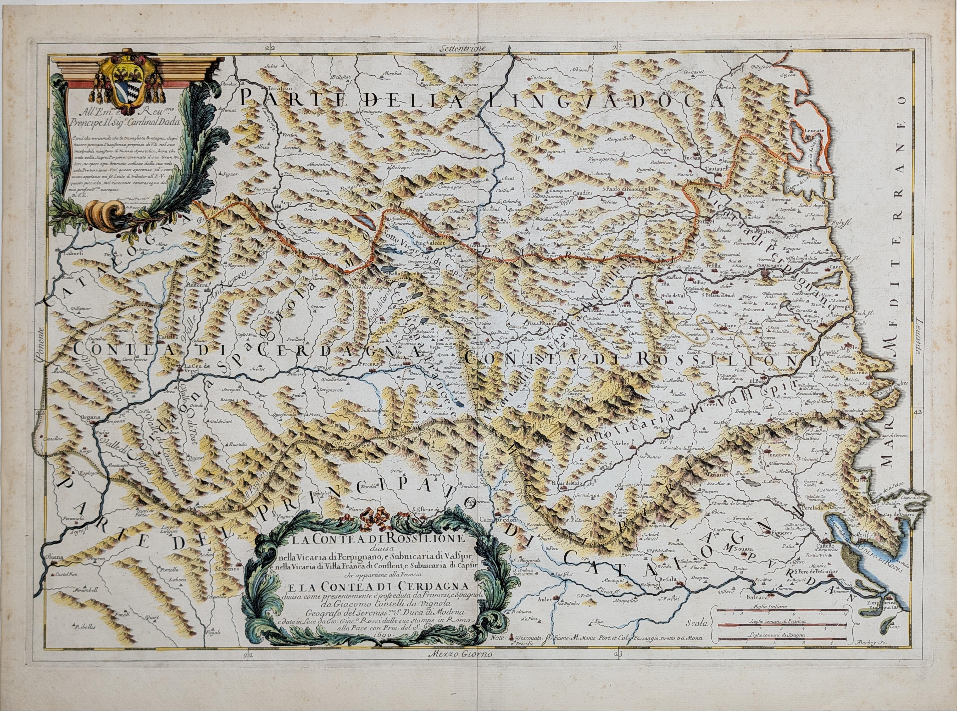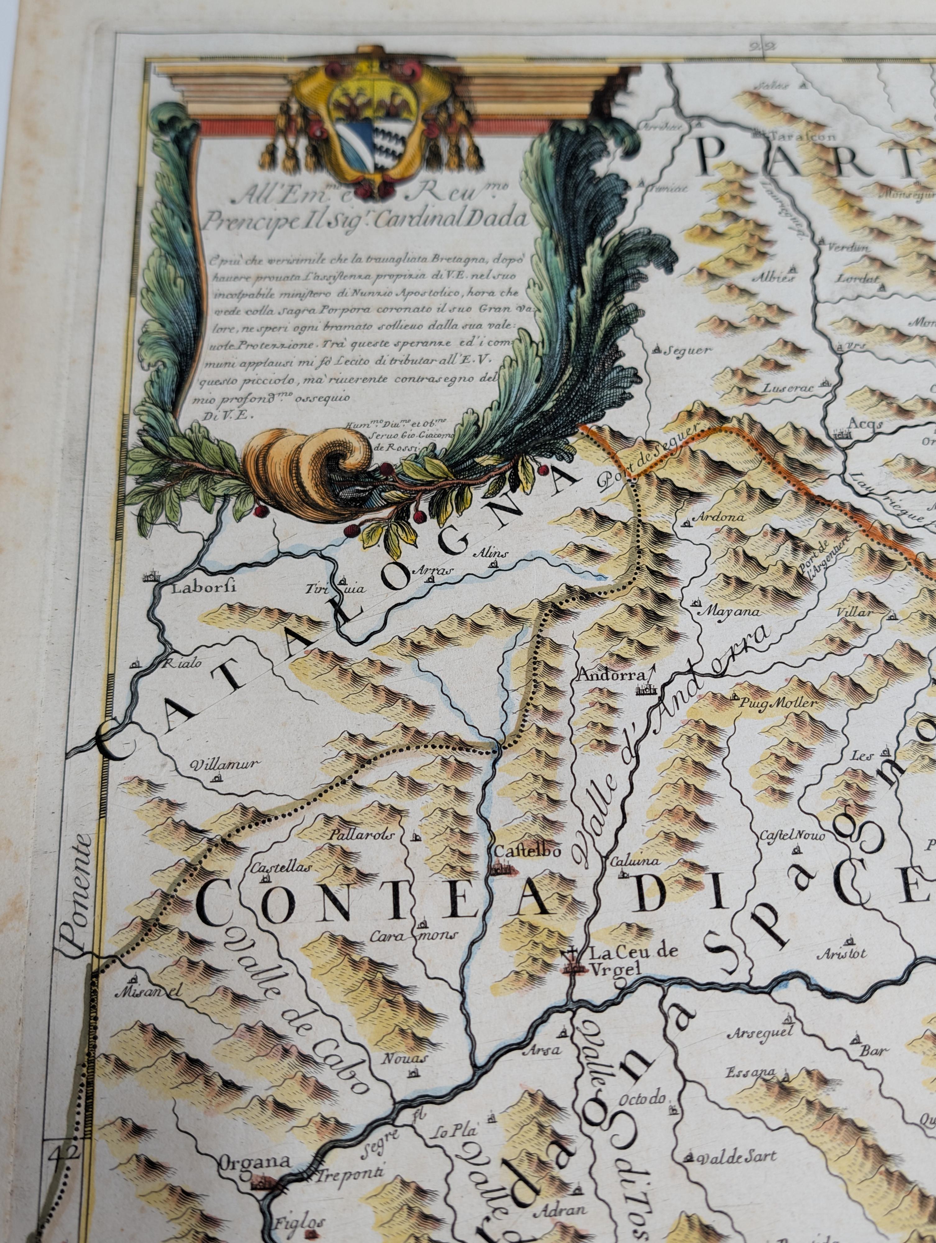 The composition is distinguished by two prominent Italian Baroque ornamental cartouches. In the lower section, a classical-style cartouche contains the title. In the upper left corner, a second, highly elegant cartouche features the dedication to Rossi’s patron, Cardinal Dada (Ferdinando d'Adda), crowned by his coat of arms. The engraving accurately identifies the Pyrenean orography and numerous towns such as Collioure, Elne, Prades, and Llivia, serving as an essential work for the study of Northern Catalonia and the present-day provinces of Girona and Lleida.