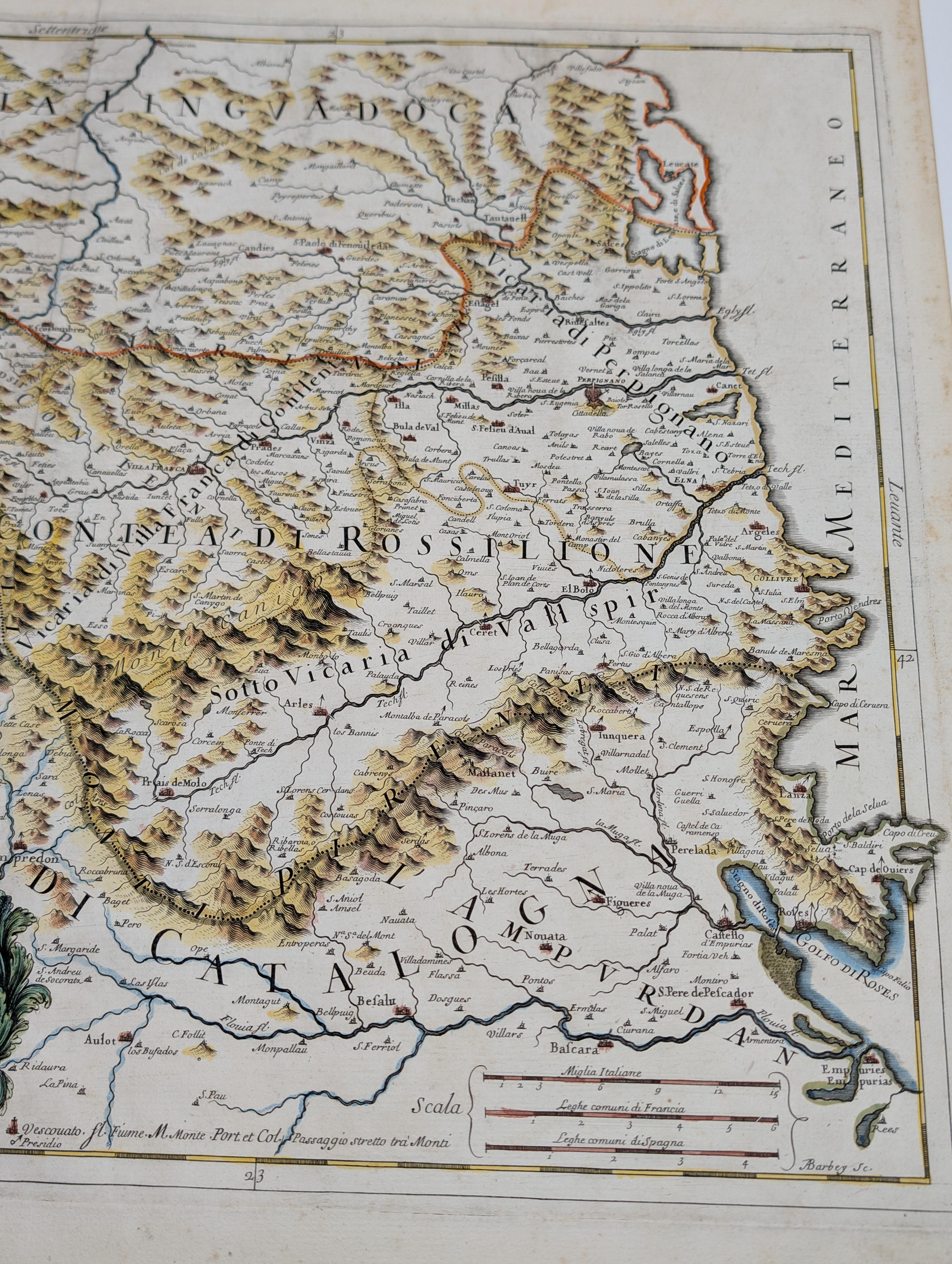 This original antique map provides a detailed representation of the counties of Roussillon and Cerdanya, documenting a critical moment in the history of the Franco-Spanish border. The piece places the reader in the complex aftermath of the Treaty of the Pyrenees (1659), the agreement that ended the Thirty Years' War and resulted in the cession of these Catalan territories to the French Crown.