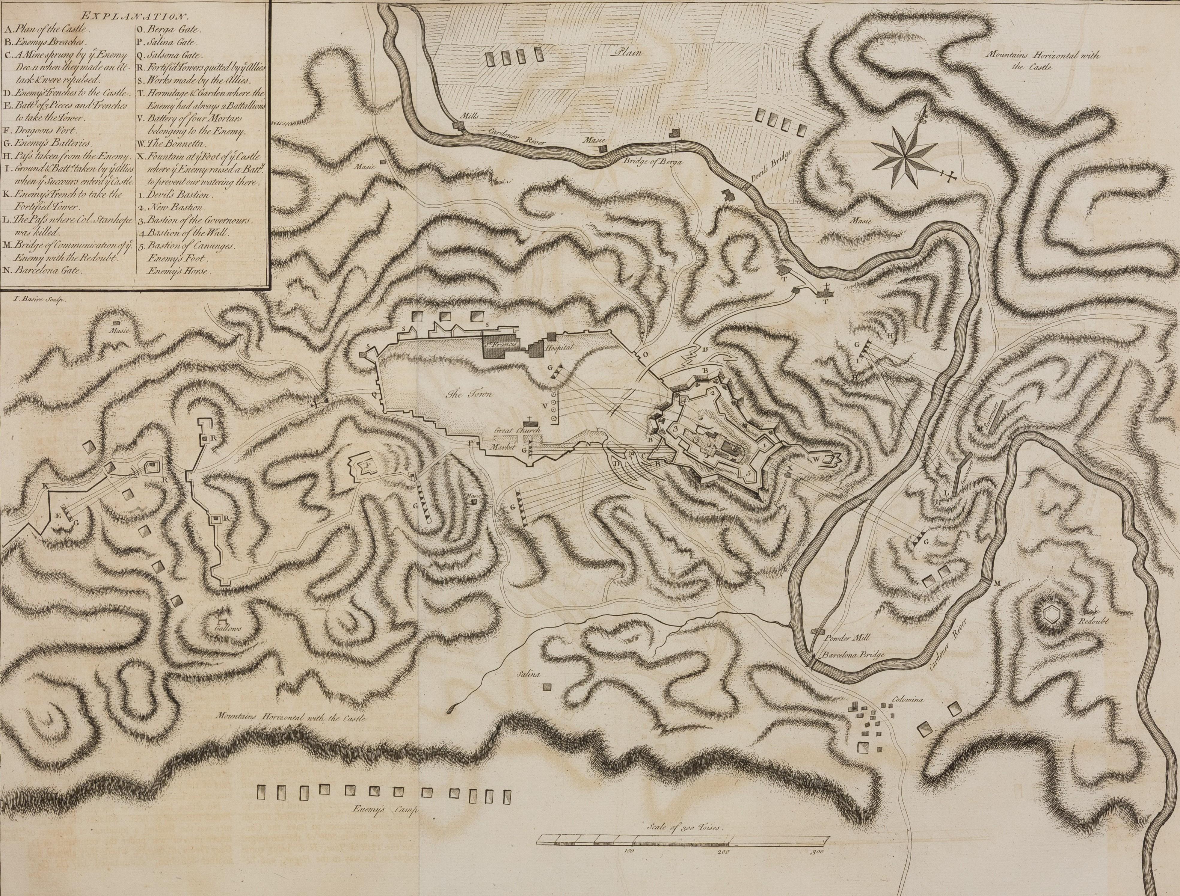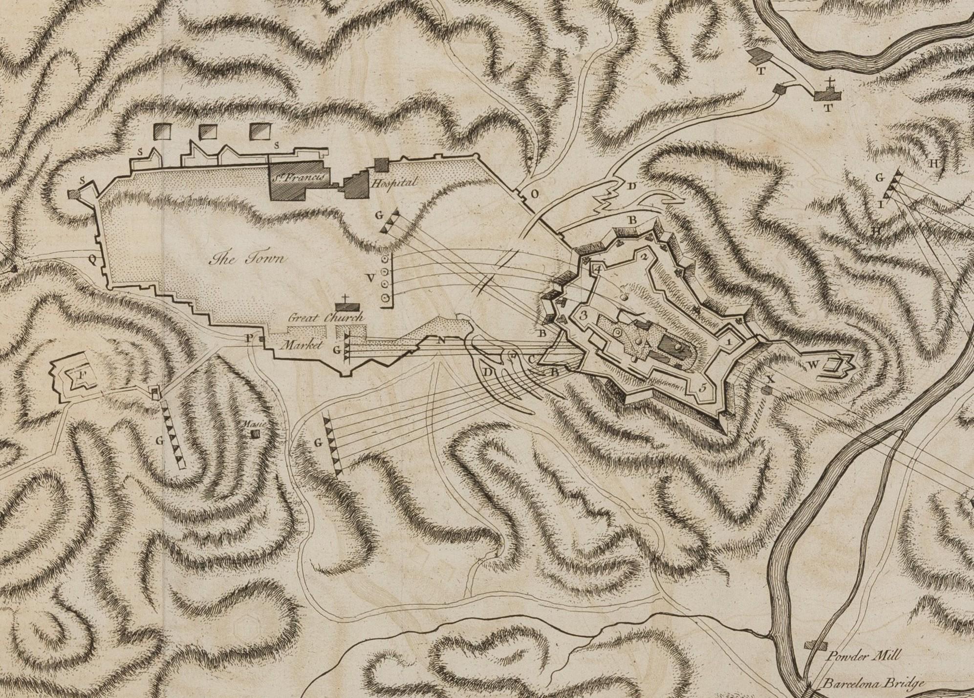Grabado topográfico de la poderosa ciudad y castillo de Cardona en Cataluña, realizado por James Basire en 1732. La representación destaca las imponentes fortificaciones y el río Cardoner, subrayando su relevancia estratégica en el contexto bélico del período.
