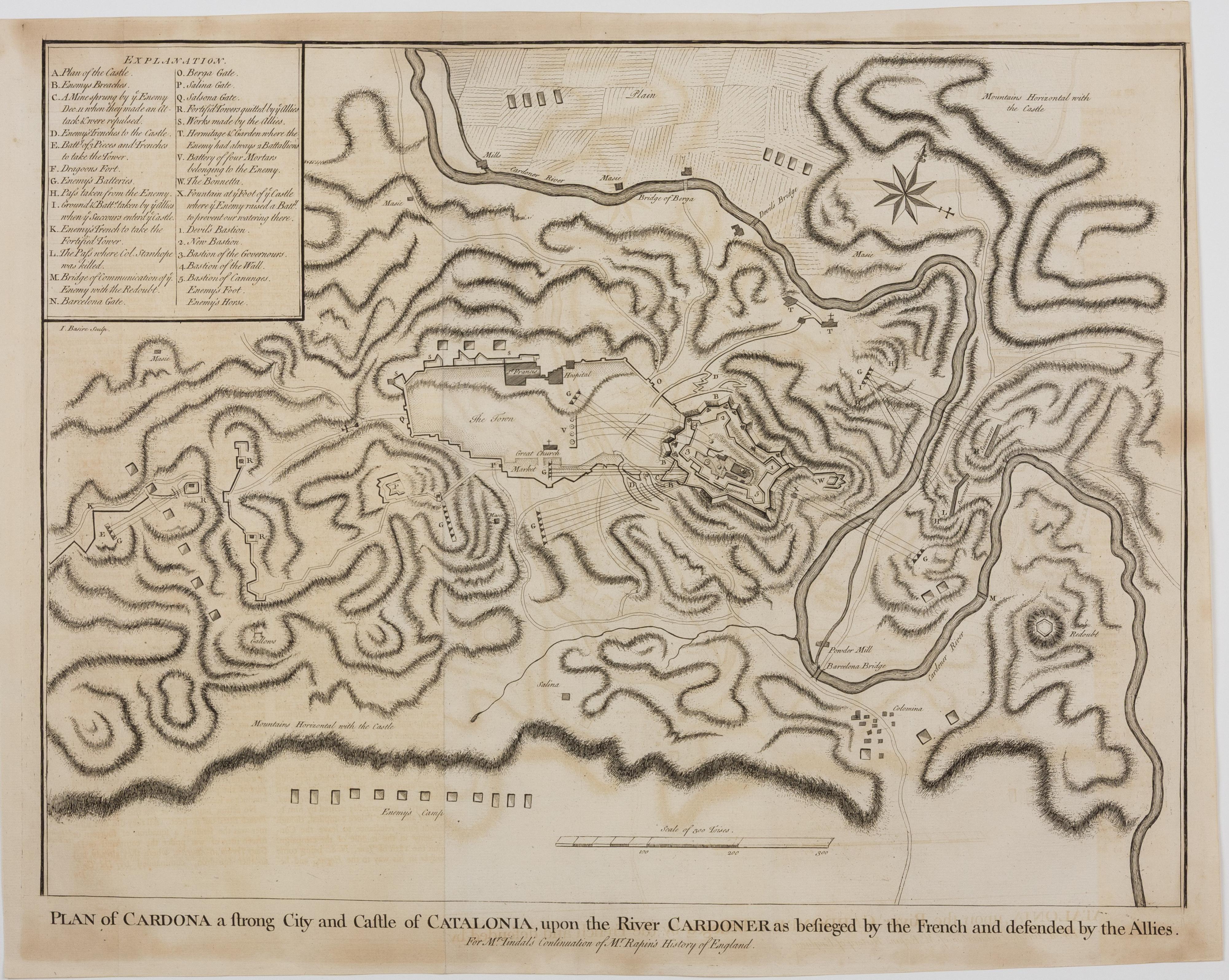 Publicada para ilustrar las batallas de la Guerra de Sucesión Española (1701-1714) en las que intervinieron tropas británicas, esta vista captura el rol de Cardona como bastión clave en las campañas austracistas contra los borbónicos. El estilo meticuloso del grabado en cobre evoca la cartografía militar británica del siglo XVIII, con detalles de escala y defensas.