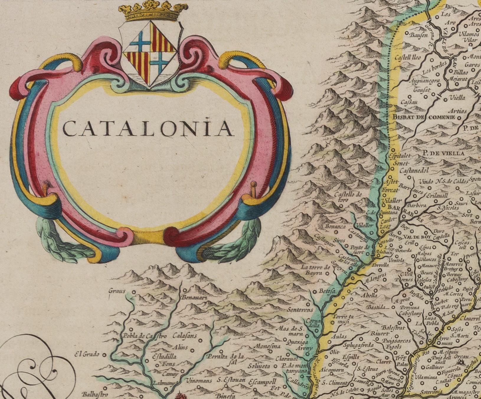 Este mapa antiguo de la región de Cataluña fue elaborado por Willem Blaeu, importante cartógrafo y editor de atlas holandés. Este mapa forma parte de la importante cartografía holandesa del Siglo de Oro, destacando la precisión y el arte en la representación geográfica de la época.