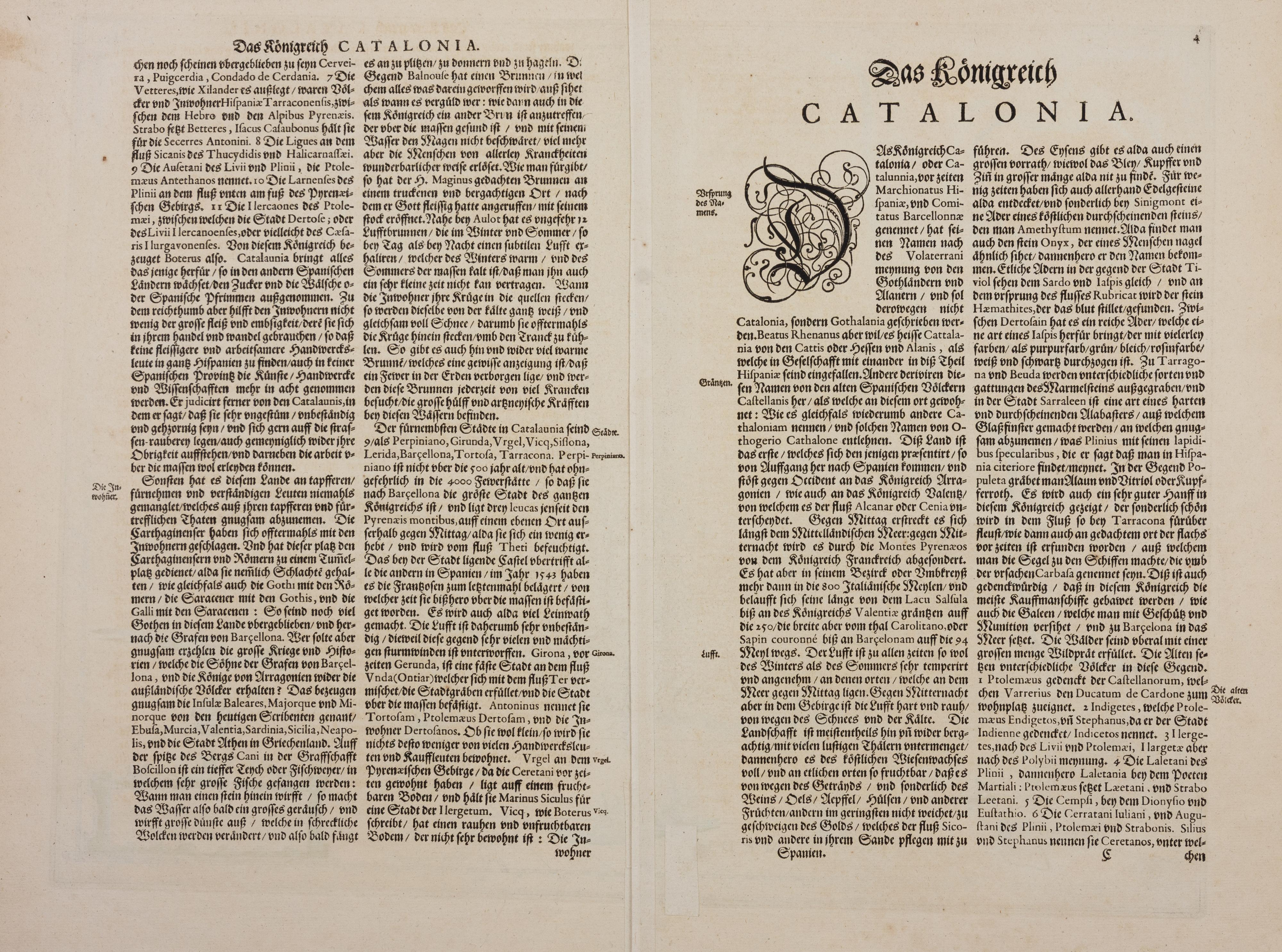 En el reverso del mapa aparece un texto en alemán donde se describe la geografía de Cataluña, además de su historia y cultura. Aparece Cataluña como un reino dentro de la Corona de Aragón y se nombran importantes ciudades como Barcelona, Tarragona, Gerona o Lérida.