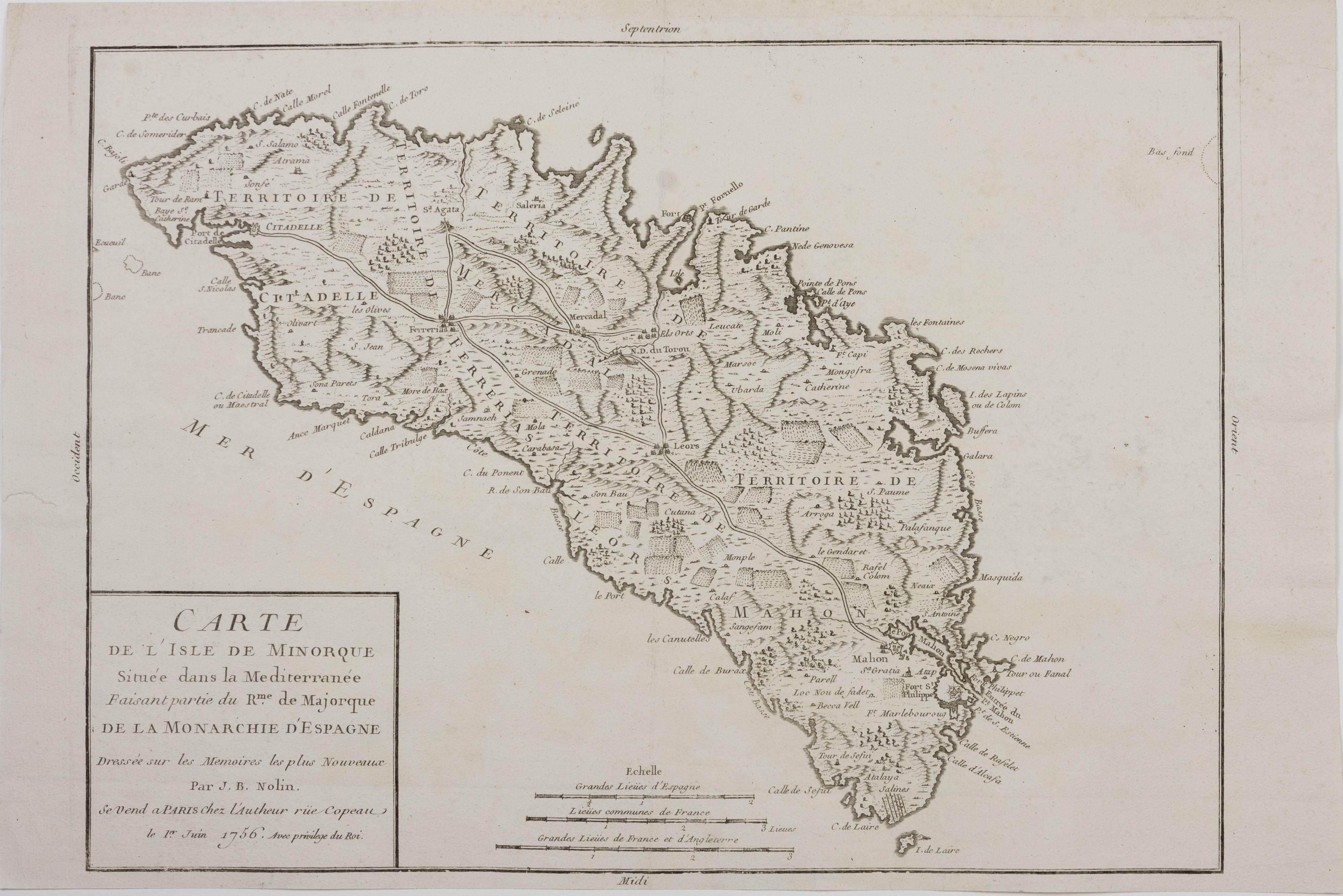 La obra de Nolin combina precisión cartográfica con una presentación artística cuidada, propia de los mapas decorativos franceses de la época. Piezas como esta eran tanto herramientas estratégicas como objetos de prestigio. Muestra en detalle la geografía costera, el relieve interior, las divisiones territoriales, caminos, fortalezas y principales localidades, incluyendo Port Mahon y Ciudadela. Incluye una cartela con el título, una escala gráfica y notas de orientación.