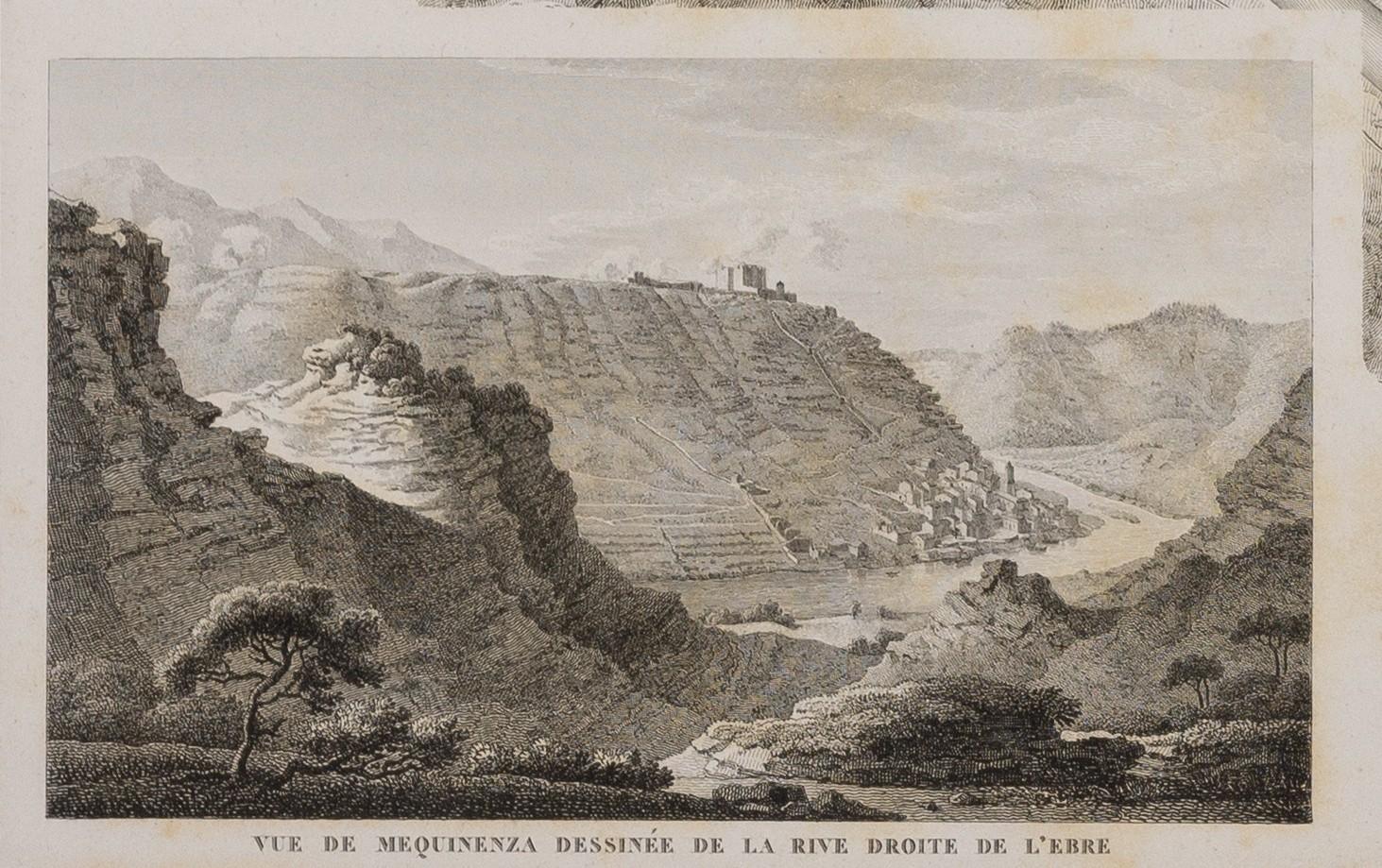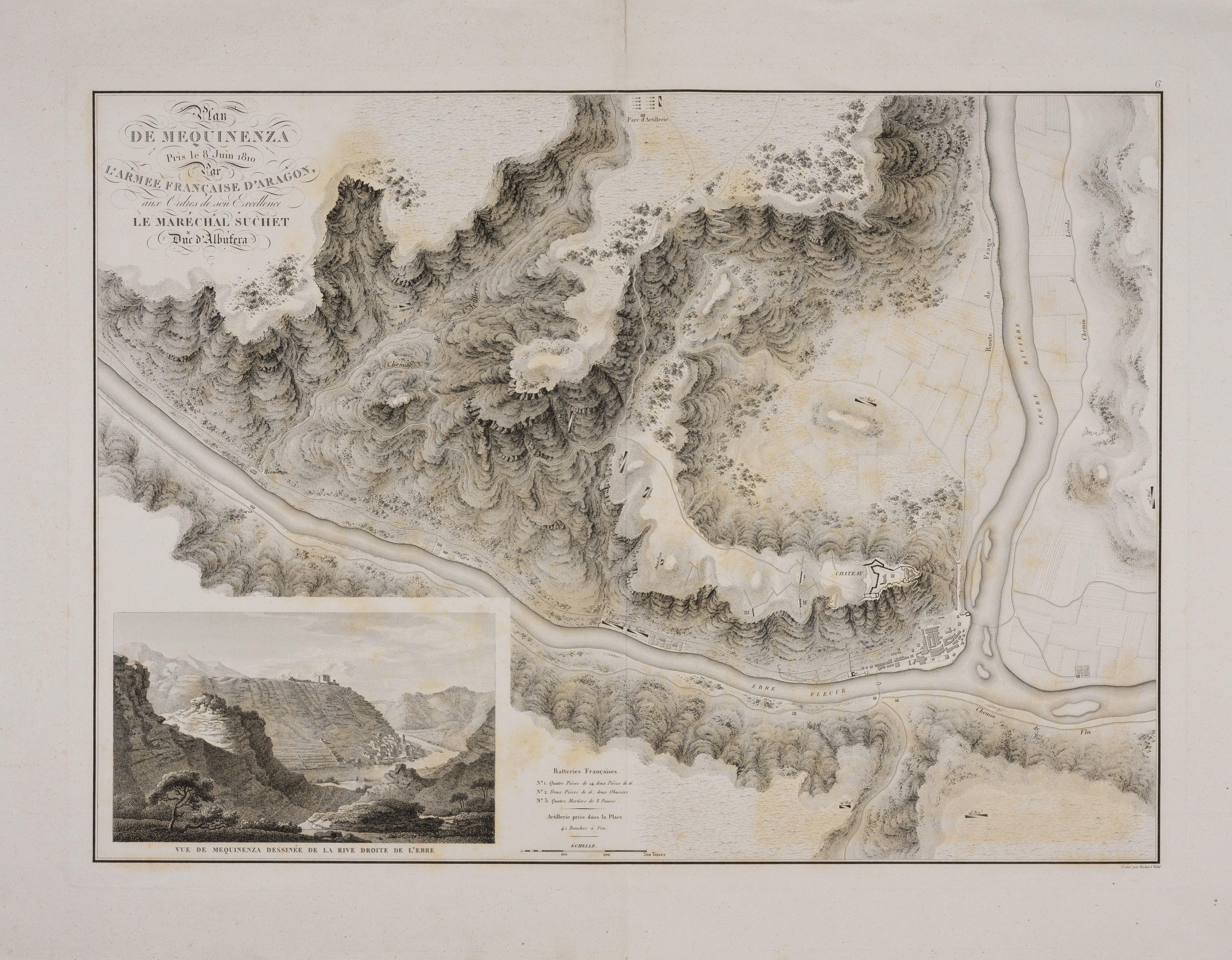 Este mapa topográfico y militar del sitio de Mequinenza durante la campaña napoleónica en España fue realizado por el mariscal francés Louis-Gabriel Suchet en 1828. Emplazada en la confluencia de los ríos Ebro, Segre y Cinca, Mequinenza fue un lugar de gran importancia estratégica durante la Guerra de la Independencia española. El mapa representa con detalle la configuración del terreno, fortificaciones, líneas de ataque y emplazamientos militares de la toma de la plaza por las tropas francesas el 5 de junio de 1810. El mapa está orientado al norte y muestra con especial detalle el relieve mediante sombreado y dibujo de líneas de nivel estilizadas. Además, en la esquina inferior izquierda, incluye una vista panorámica artística del paisaje y el castillo de Mequinenza dibujada desde la orilla derecha del río Ebro.