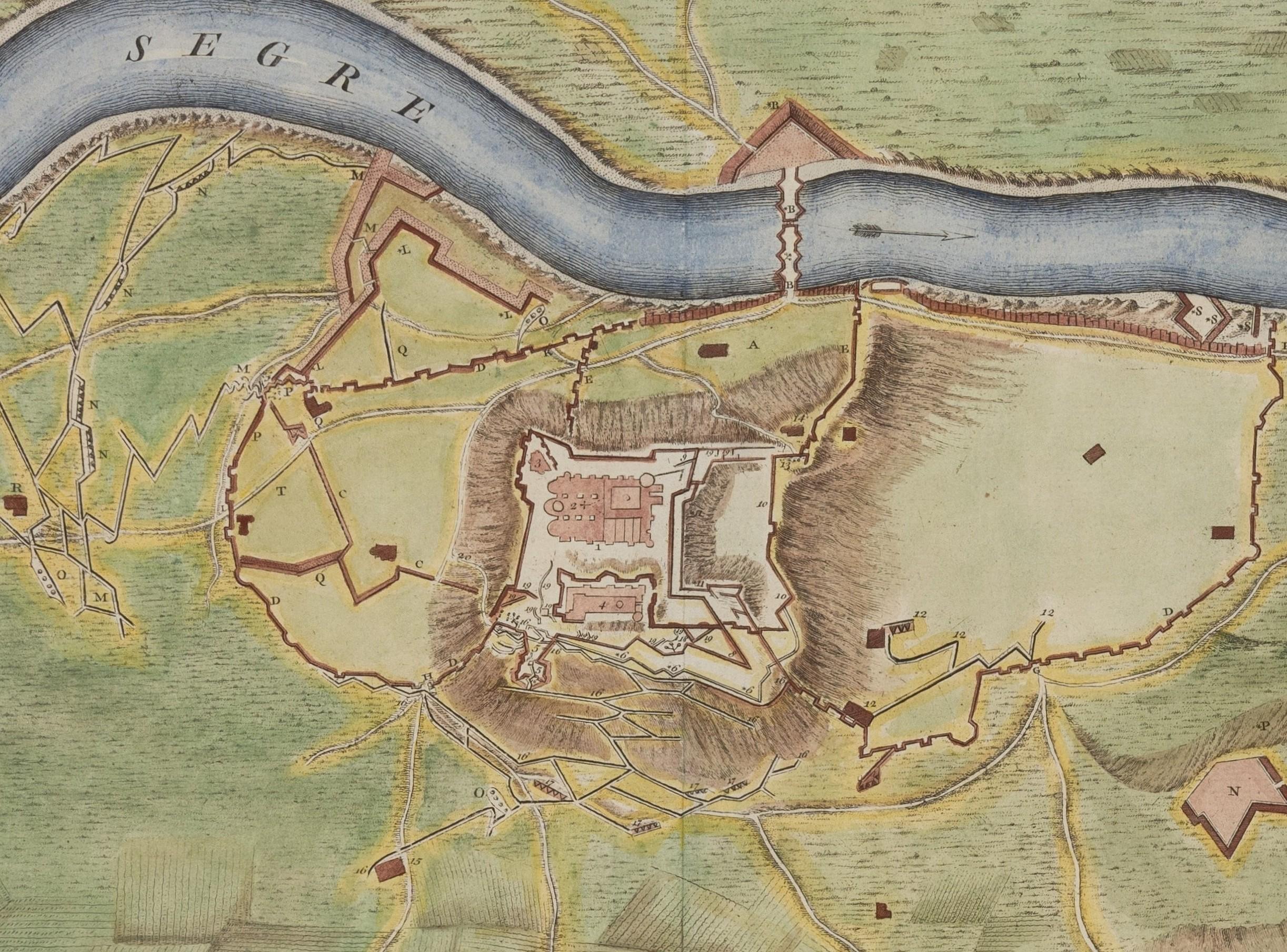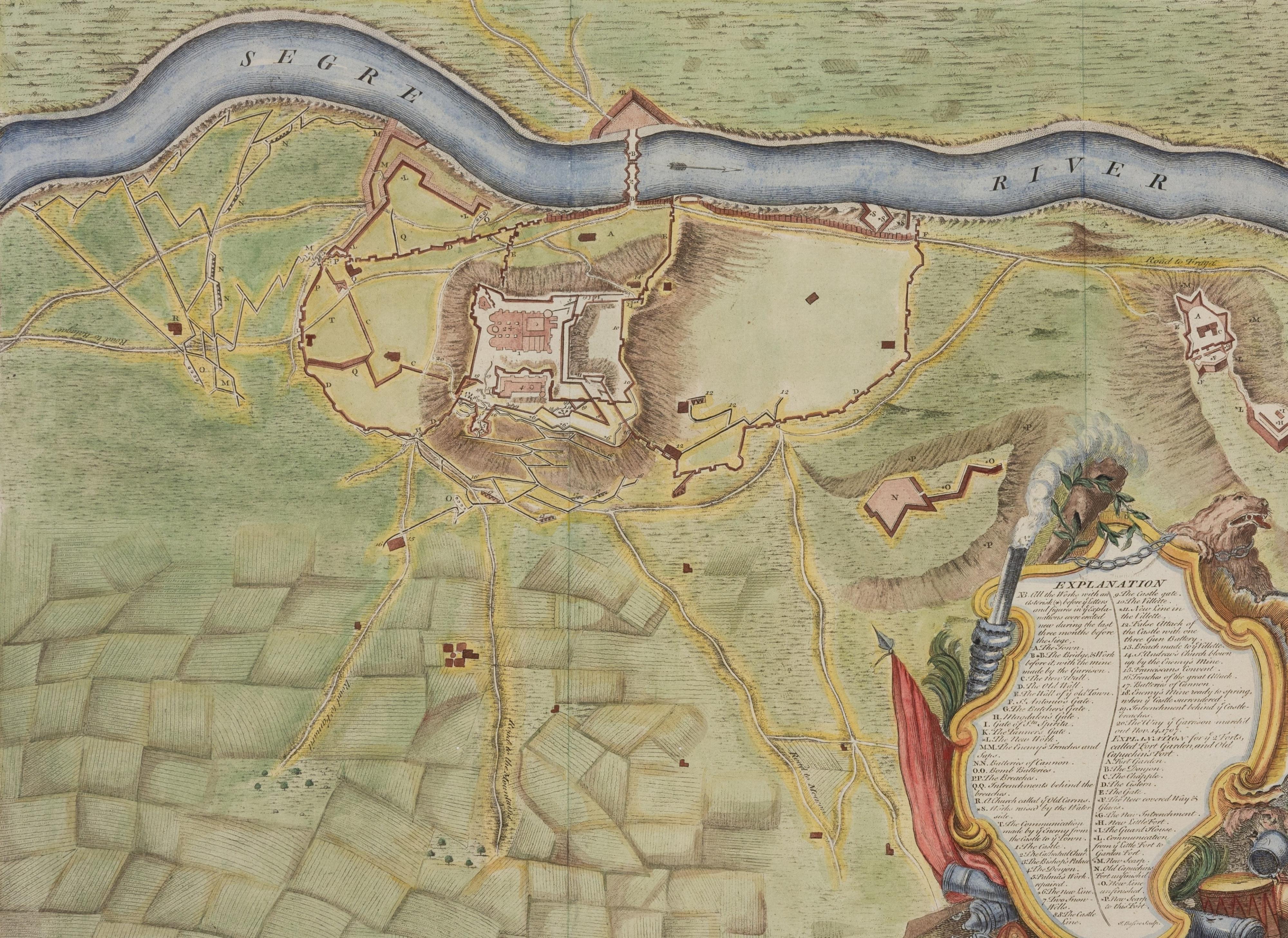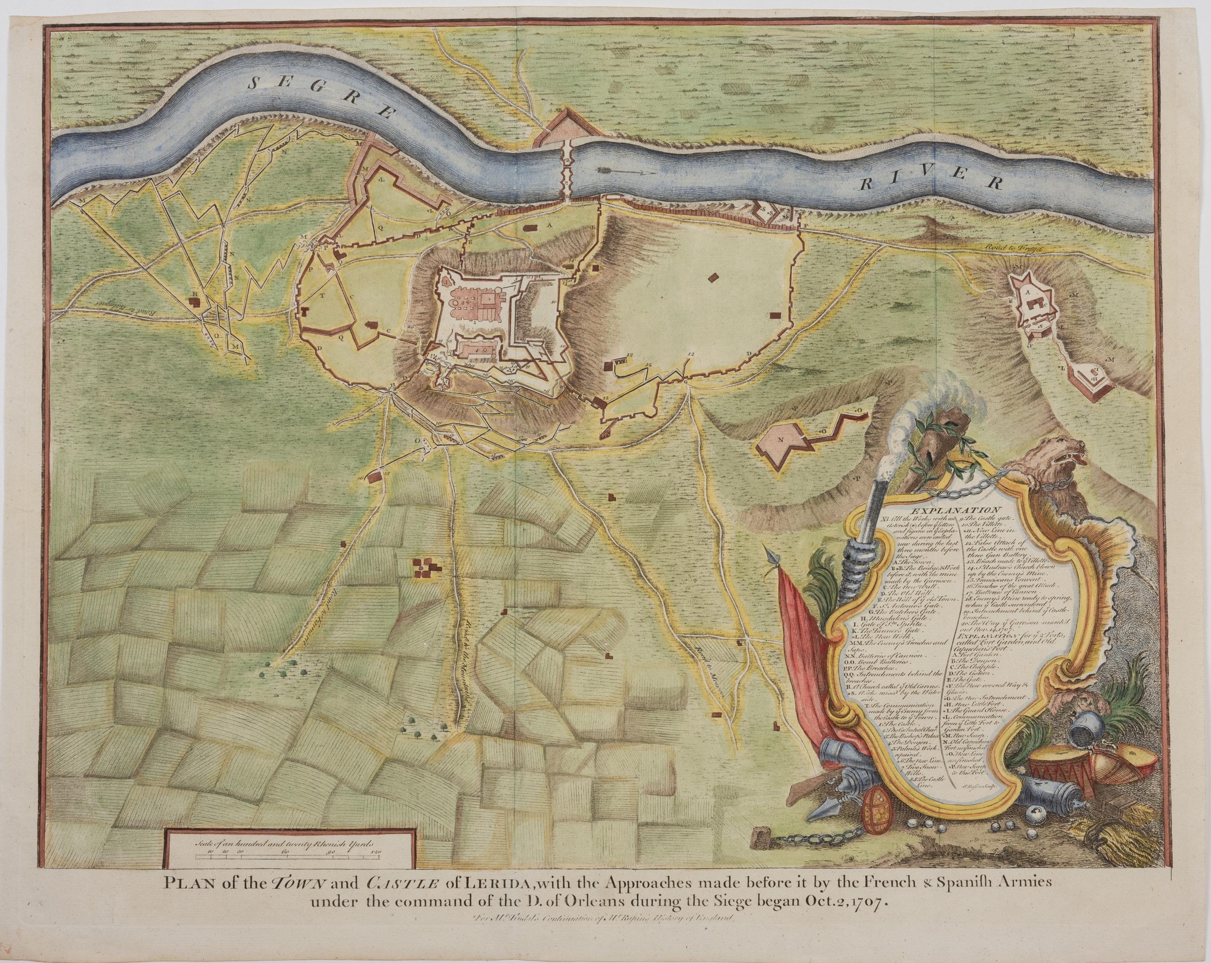Este plano militar de la ciudad y el castillo de Lérida (Lleida, Cataluña) fue realizado por James Basire, importante grabador británico del siglo XVIII. Representa el asedio iniciado el 2 de octubre de 1707 por los ejércitos francés y español bajo el mando del Duque de Orleans durante la Guerra de Sucesión Española. El mapa muestra las líneas de aproximación, fortificaciones, posiciones militares y geografía circundante, incluyendo el río Segre. Está decorado con una cartela barroca en la esquina inferior derecha, con motivos militares y heráldicos.
