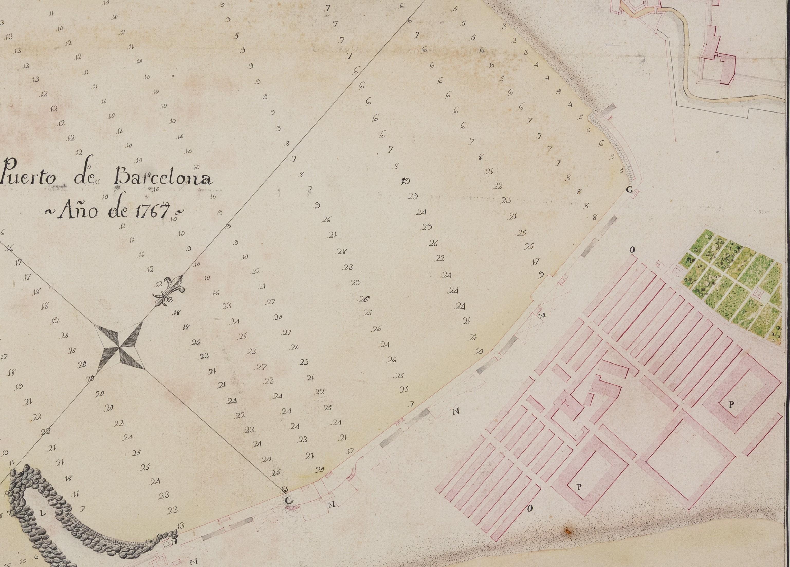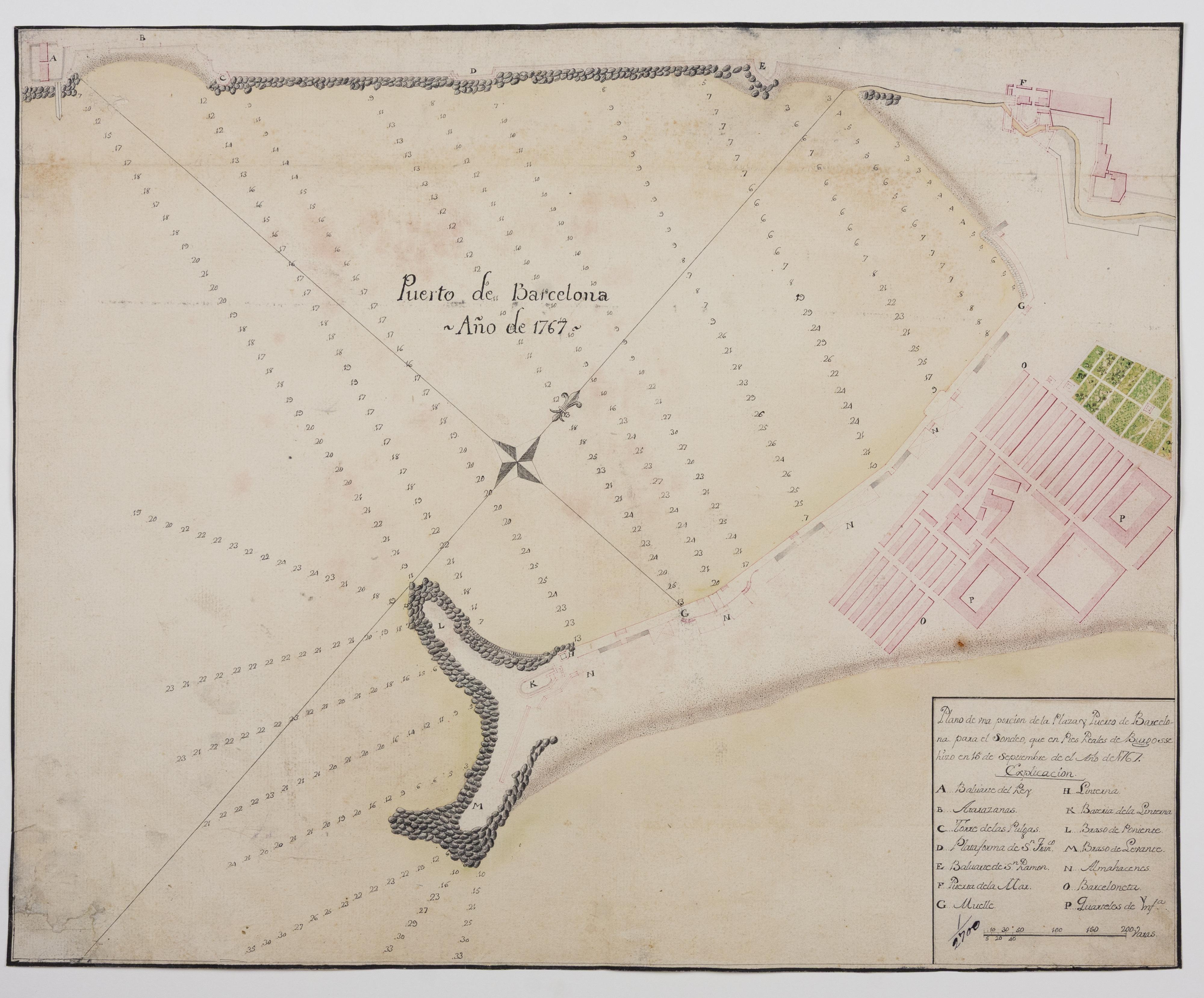 Este plano manuscrito del puerto de Barcelona, realizado en el año 1767 y de autor desconocido, representa con notable precisión la infraestructura marítima de la ciudad en pleno siglo XVIII, incluyendo elementos clave como la muralla del muelle, el fuerte de la escollera, el recinto del arsenal, almacenes, depósitos, y zonas de actividad comercial. El mapa también detalla las profundidades del fondo marino mediante cifras (probablemente en pies o varas), organizadas en líneas de sondeo que irradian desde un punto central, lo que revela su utilidad como plano náutico de orientación portuaria. En la cartela de la parte inferior derecha se identifican 14 puntos de interés señalados con letras, incluyendo el baluarte del rey, la torre de las Pulgas, los almacenes reales y la Barceloneta, entre otros.