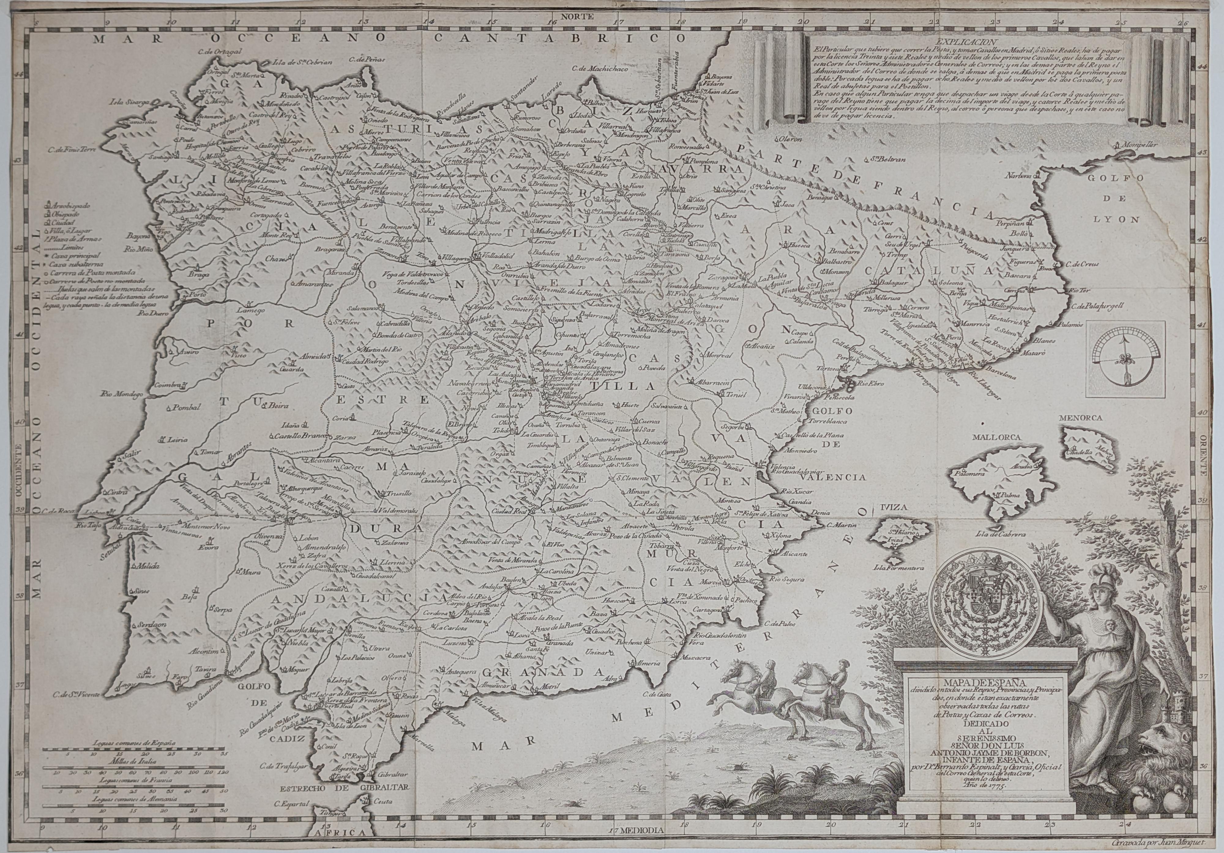 On the left side, the engraving includes an exhaustive legend for locating archdioceses, dioceses, cities, towns, and military strongholds. It also identifies postal routes, distinguishing between mounted and unmounted courier paths. Engraved by Juan Minguet, a master from the Royal Academy of San Fernando, the map accurately covers the entire Peninsula, including the coasts of Catalonia, Valencia, Andalusia, Galicia, and the Basque Country.