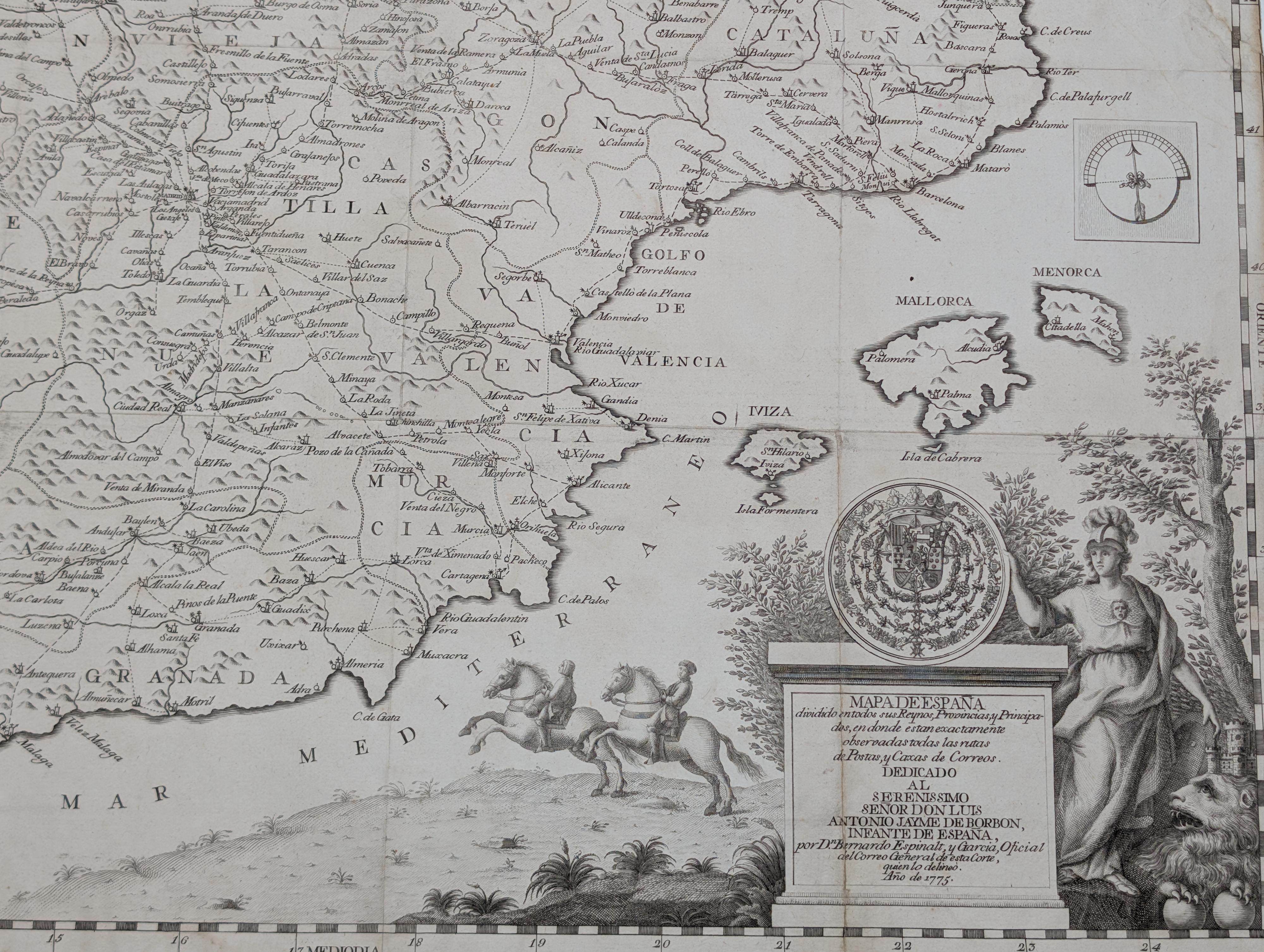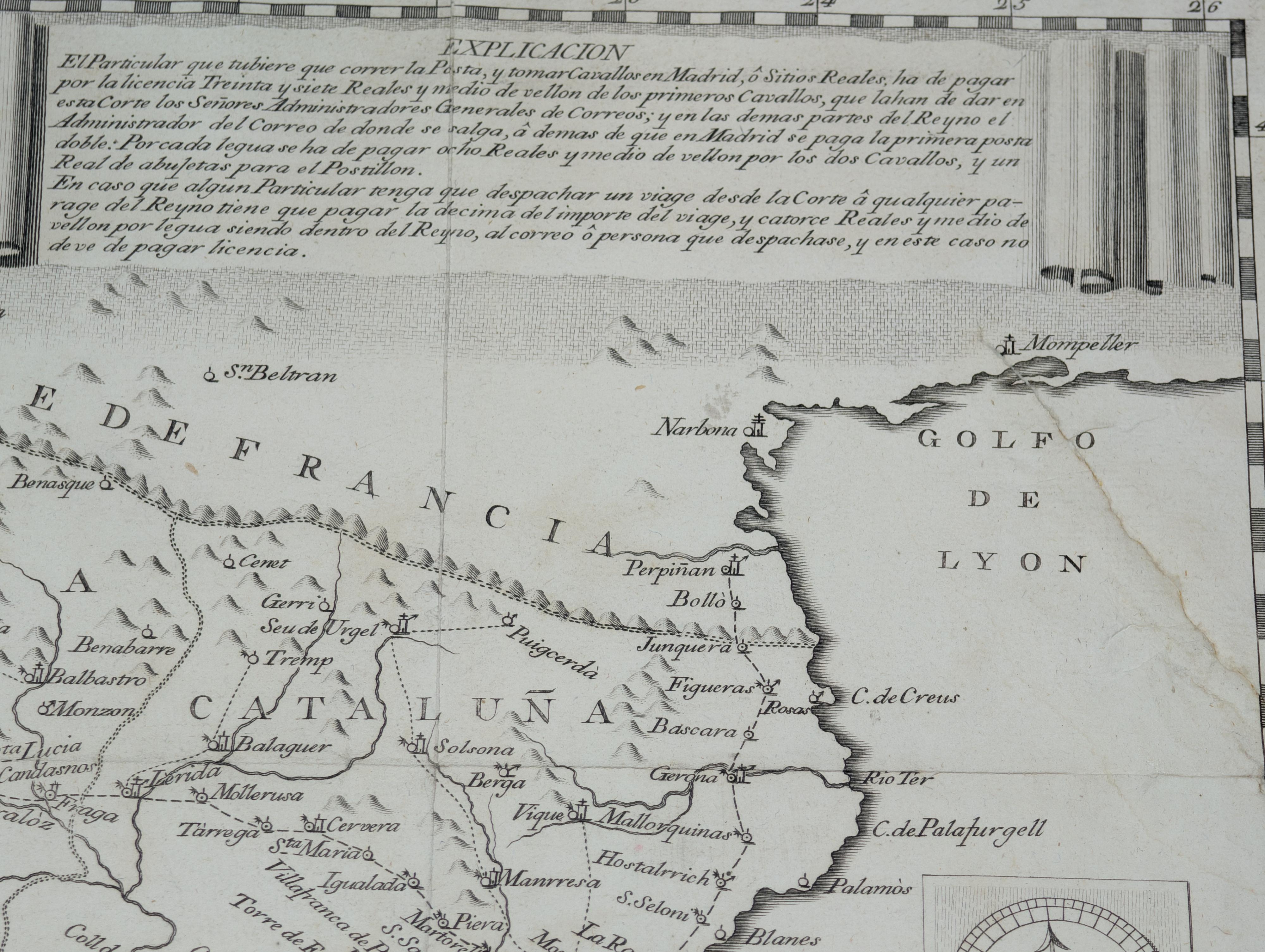 Este mapa antiguo original es un testimonio del espíritu científico y administrativo impulsado por las reformas borbónicas en el siglo XVIII. Se trata, seguramente, de uno de los mapas españoles más decorativos realizados hasta el año 1800, reflejando además la voluntad de la Corona por cartografiar con precisión las rutas de postas y correos de España bajo criterios de eficiencia ilustrada. La pieza es sumamente escasa; sin registros en Rarebookhub y con una sola entrada localizada en WorldCat / OCLC (Biblioteca del Ministerio de Defensa, Madrid).