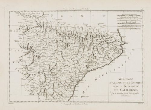 Elaborado por Rigobert Bonne, reconocido ingeniero-hidrógrafo del Depósito de la Marina de Francia y uno de los cartógrafos más influyentes de su época, este mapa representa los antiguos reinos de Aragón y Navarra durante el siglo XVIII. El mapa muestra con detalle la división política, las principales ciudades, ríos, cordilleras y líneas costeras, con una representación clara y precisa típica del...